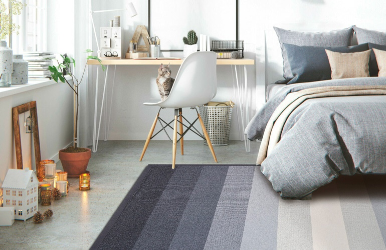 В скандинавском стиле используются достаточно спокойные цветовые оттенки: серый, светло-голубой, синий, приглушённый зелёный, коричневый, чёрно-белый. Чтобы оживить интерьер, можно добавить всего несколько интересных аксессуаров и ковёр в том числе!