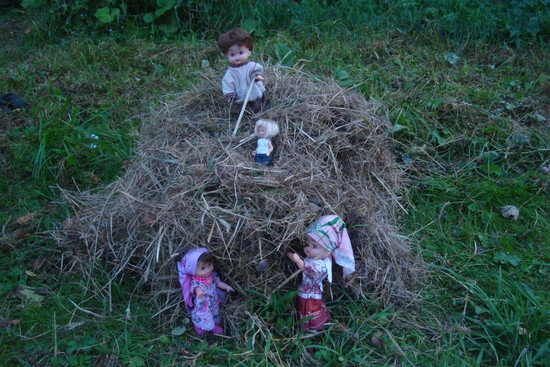 Для деревенских домовых наступила горячая пора: надо запасти корм на всю зиму для поголовья коров, лошадей, коз, овец. Молодежь сгребала душистую сухую траву граблями, связывала в снопы под веселую песенку: