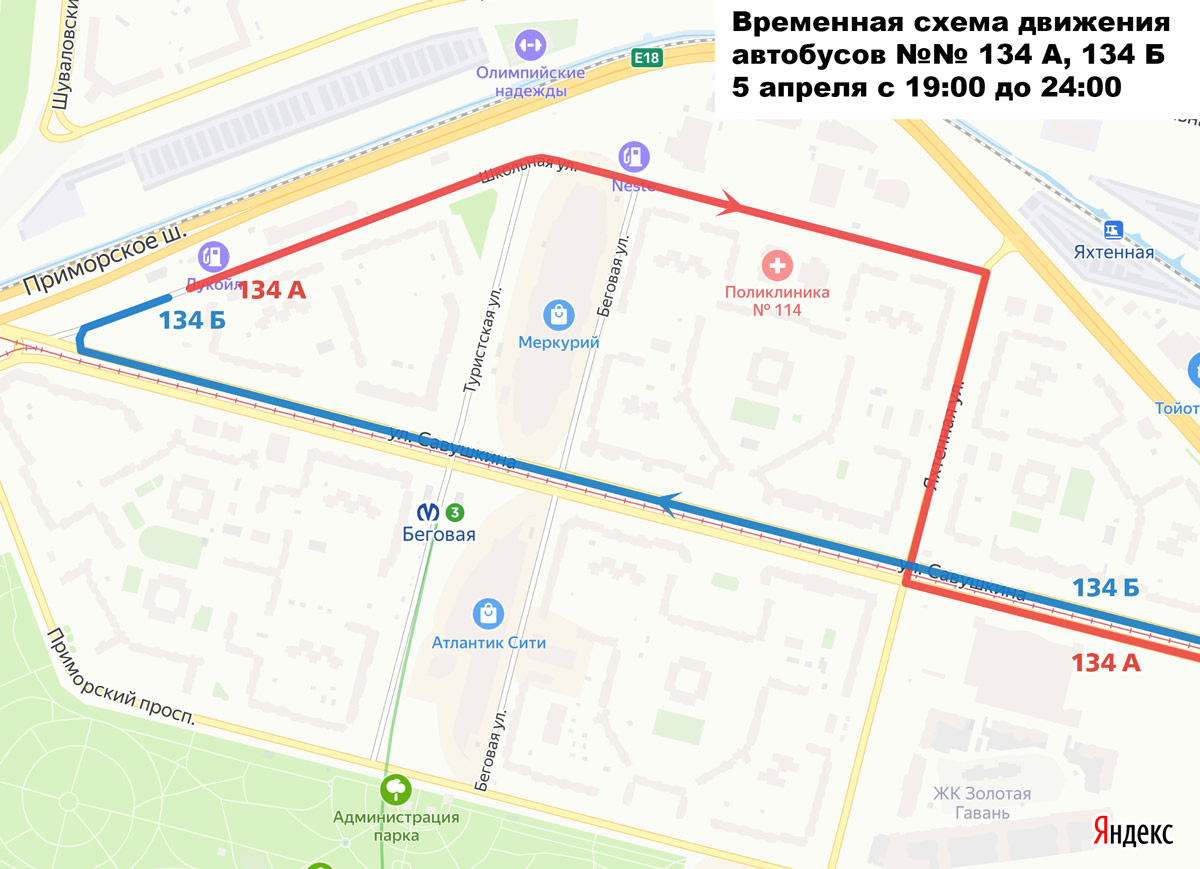5 апреля , в связи с временным перекрытием движения по Рюхиной улице и Яхтенной улице, автобусы будут следовать с