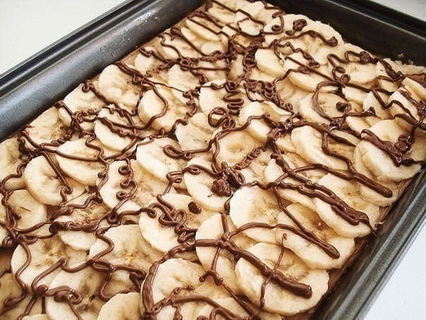 6. Нарезать два банана на тонкие кружочки. Украсить запеканку. Сверху запеканку можно дополнительно полить шоколадной глазурью. Готово!