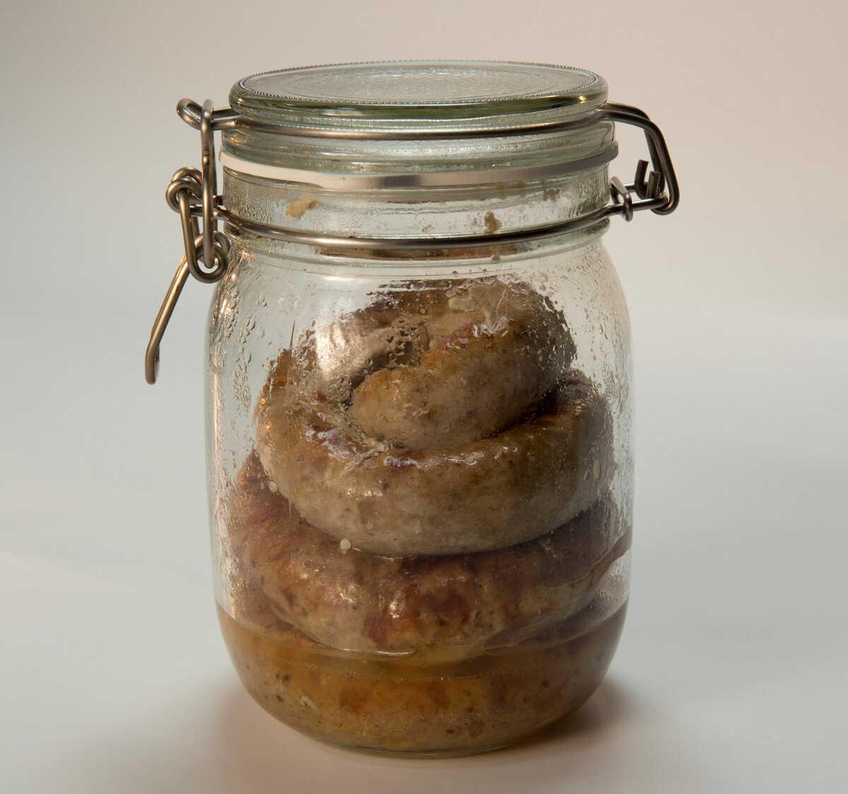 5. Стерилизуем банку. Перекладываем колбасу в банку. Выливаем оставшийся жир в банку. Ставим пастеризоваться в аэрогриль при 170 градусах или в духовку при 120 градусах на 15-20 минут.