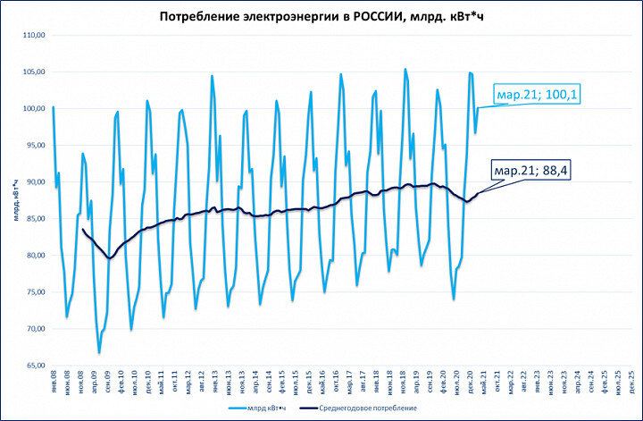 В марте потребление электроэнергии достигло 100,1 млрд. кВт-час.
