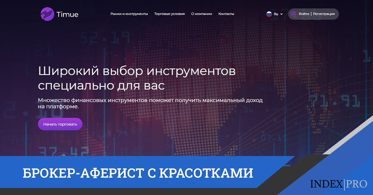 С первых минут пребывания на сайте посредника возникает непреодолимое чувство «дежавю» — интерфейс ресурса кажется уж очень знакомым, что в действительности подтверждается фактами. Да, именно по такому шаблону созданы и другие брокерские страницы, среди которых FxAmo, Trust Meridan и Avex Capital. Компании связывает наличие стоковых изображений, расположение текста на сайтах, однотипные рубрики и даже идентичные условия торговли. Ранее указанные бренды были уличены в мошенничестве, что делает сходство данных отрицательным показателем для Тимуе. Рассмотрим сам сайт брокера: клиента встречают громкие заявления, новостные материалы со сторонних сайтов, а также краткое описание торговых условий.