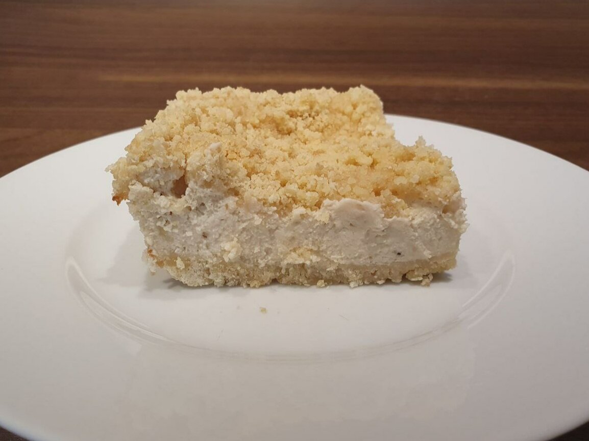 4. Вылейте творожную смесь на песочный слой и посыпьте сверху оставшуюся крошку