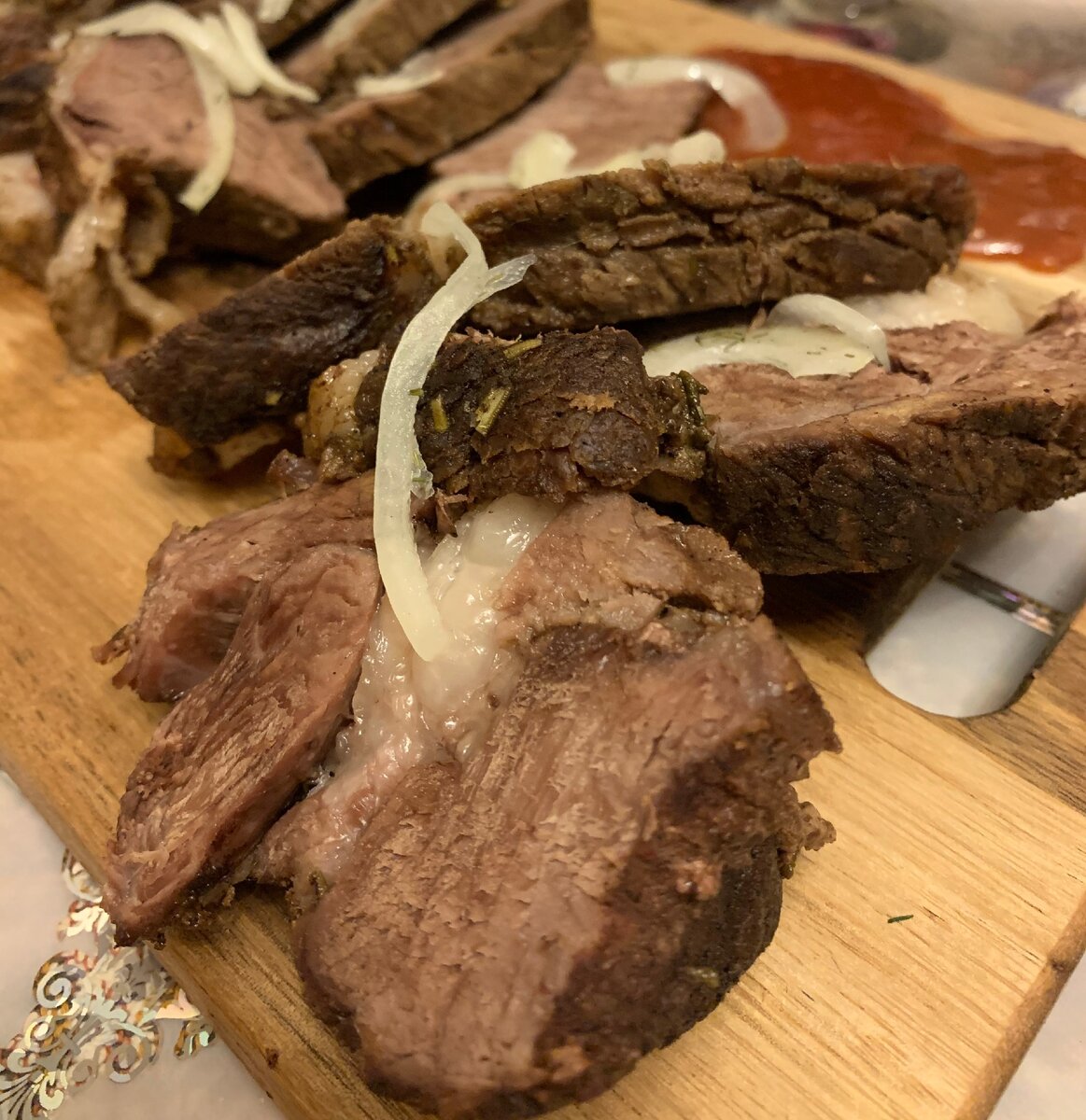 Всем доброго времени суток, делюсь с вами рецептом запечёного мяса (у меня говядина , можно взять любое мясо по вашену желанию) в духовке. Вот рецепт: Взял 2-2,5кг говядины. Приправы перец, базелик,прованские травы, паприка, молотой зиры. Растительное масло , соевый соус и чеснок. Берём мясо,промываем и обсушиваем бумажным полотенцем. Специи перемешиваем с соусом и маслом. Обмазываем кусок мяса маринадом и посыпаем мелко нарубленным чесноком. Закрываем пищевой плёнкой и отправляем в холодильник на 2 часа. Достаём с холодильника, даём нагрется до комнатной температуры. Затем сворачиваем и обвязываем бичёвкой. Заворачиваем в бумагу для выпечки а затем в фольгу. И в духовку на 2,5-3 часа. Достаём и распаковываем. Получилось вот такое мясо. Семье очень понравилось! Приятного аппетита!!! Кому понравилось , незабудьте подписаться и поставить "нравится". До скорых встреч!!!