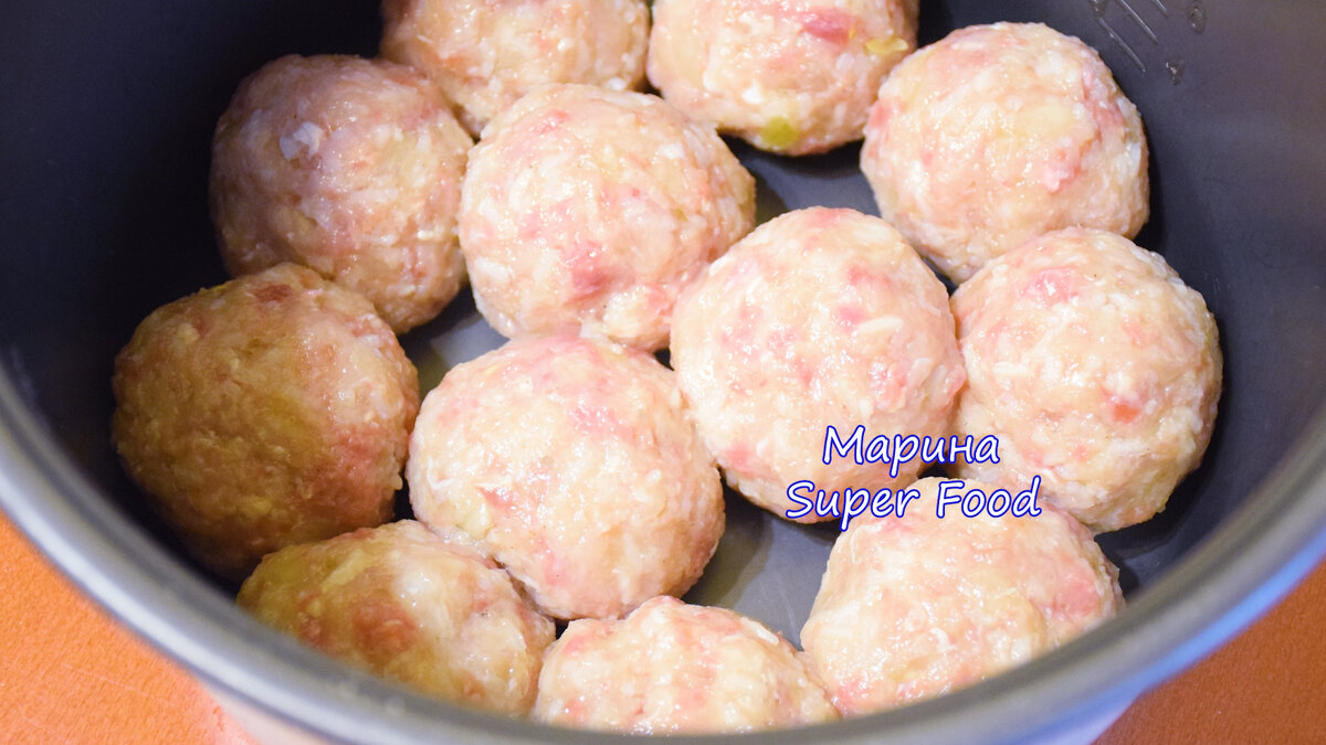 5. Смоченными в воде руками лепим тефтели. Я их буду готовить в мультиварке. Выкладываю их на дно формы.