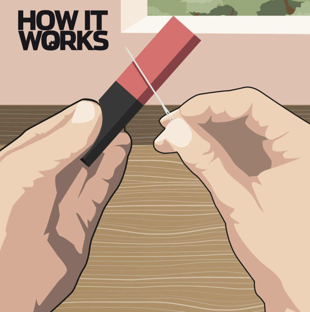 Протирая магнитом иглу, вы перемещаете заряженные частицы внутри металла, называемые электронами. Обычно все они направлены в разные стороны, поэтому металл иглы не имеет магнитного притяжения в каком-либо конкретном направлении. Однако, когда вы протираете магнитом иглу, все частицы выстраиваются в линию, создавая заряд в одном направлении.