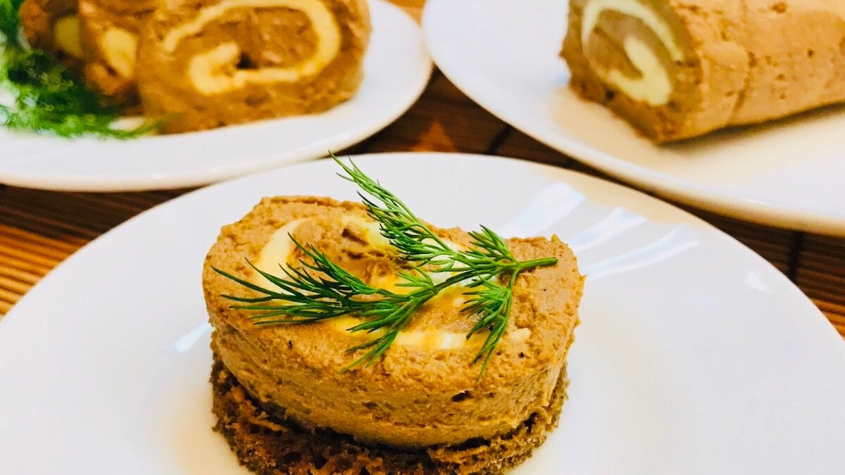 - На остывший паштет намазываем сверху размягченное сливочное масло. Осторожно при помощи пленки сворачиваем паштет с маслом в виде рулета.
