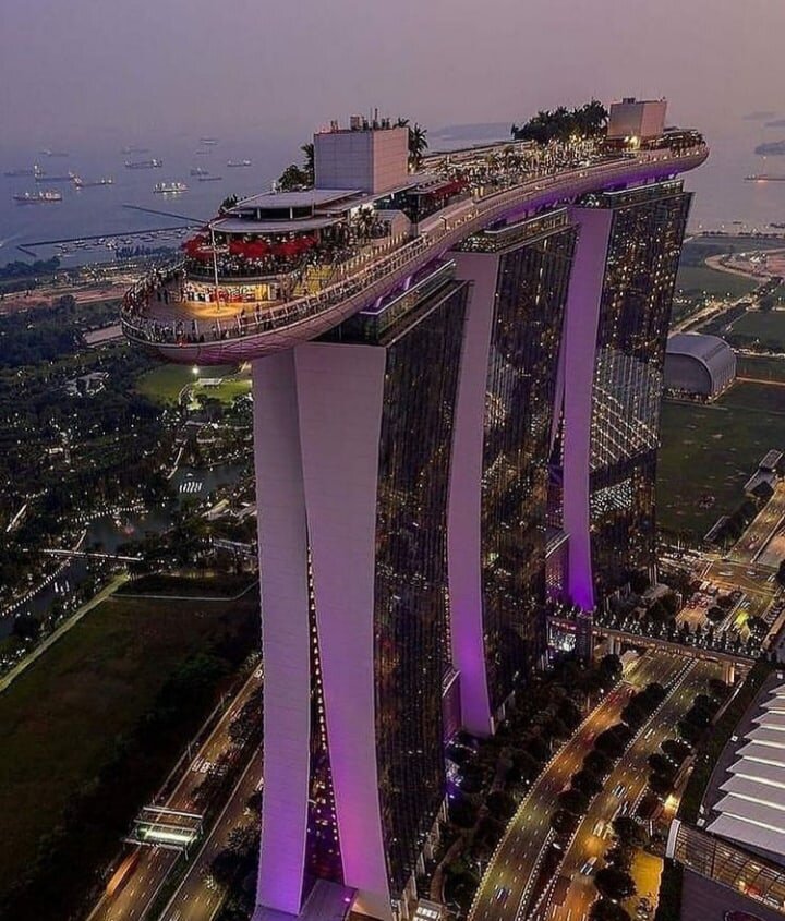 Это здание расположено в Сингапуре. На трех небоскребах был встроен "корабль", на котором есть шикарный бассейн с не менее шикарном видом.