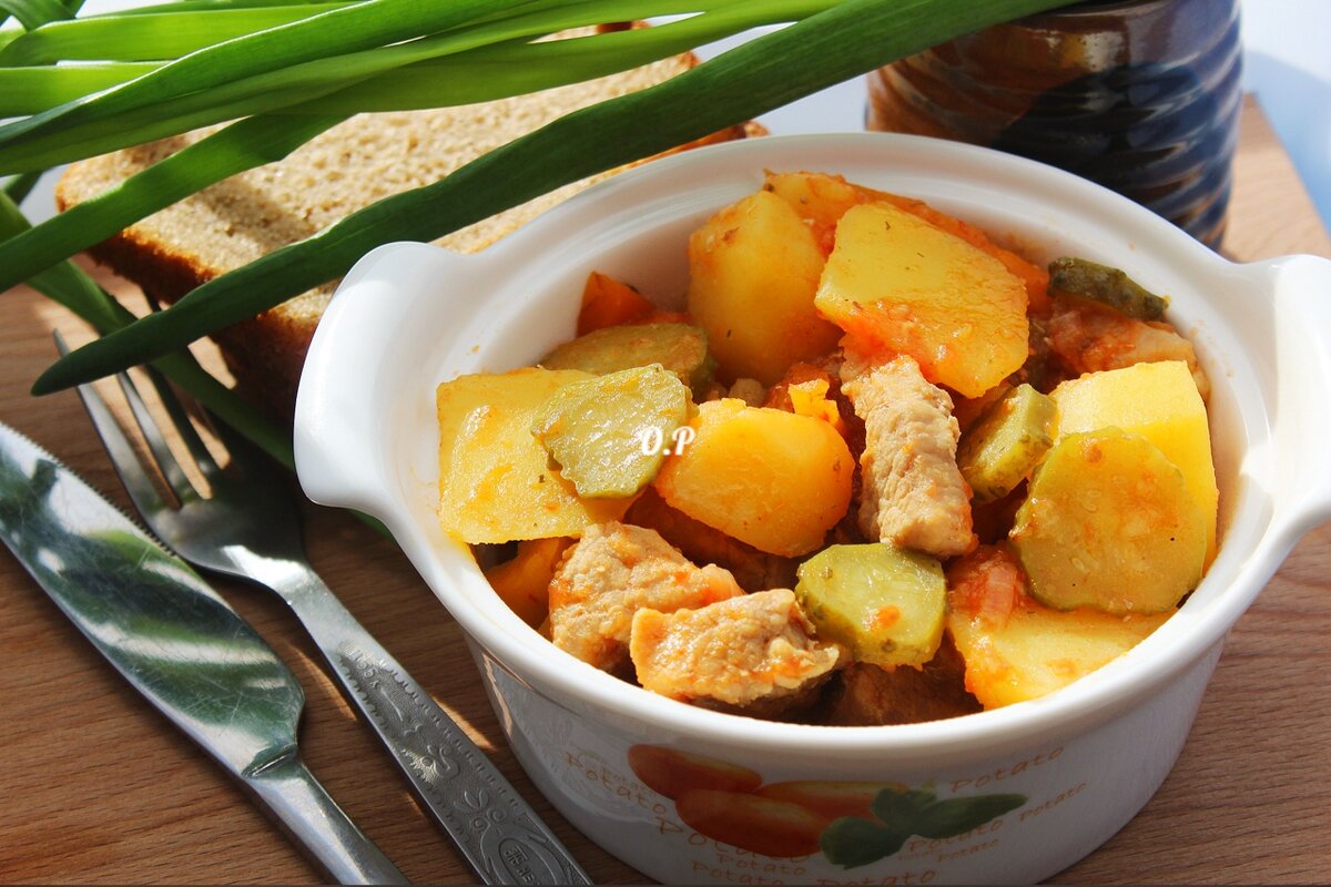 Очень вкусная тушенная картошечка с мясом и маринованными огурчиками.Мясо можно взять любое,говядину,баранину и даже курицу я приготовила со свининой.Получилось очень вкусно и огурчики очень приятно похрустывают и придают свою пикантность и интересное сочетание.