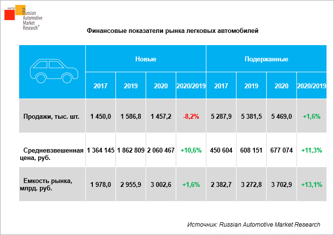 Согласно данным Russian Automotive Market Research , по итогам 2020 г. продажи новых легковых автомобилей в России снизились на 8,2%.