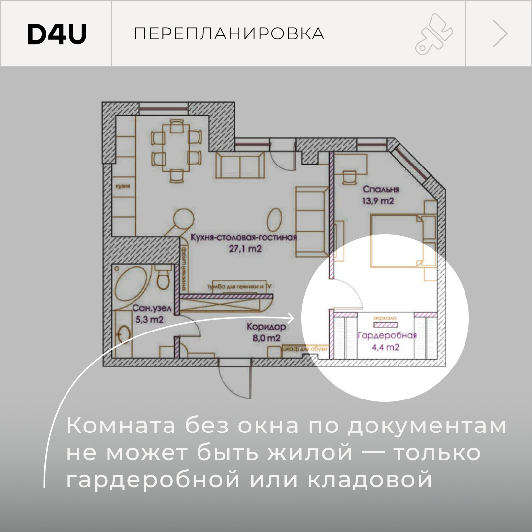 Приходится искать варианты, как выкроить место для дополнительного помещения. И нередко в этом варианте нет окон. Но по СНиПам в жилой комнате обязательно должно быть естественное освещение. Поэтому при согласовании придётся назвать помещение кладовой или гардеробной. Но поставить там кровать никто не запретит.