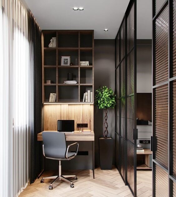 Если раньше были некие споры по поводу утепления балкона, то сегодня это уже считается верным решением. Из него можно сделать отличный полноценный рабочий кабинет, который уже является «жизненной необходимостью». Разделить обе комнаты позволят стеклянные перегородки. Интерьер балкона может не повторять, но вот соответствовать дизайну примыкающей комнаты он обязан.