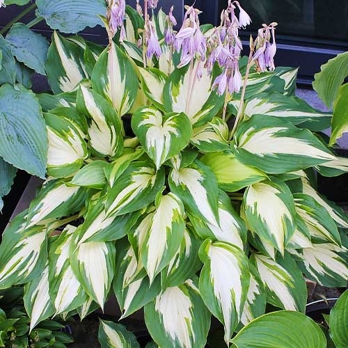 Хоста Christmas Candy - Листовая пластина плотная, появляется из земли шартрезной, затем становится цвета слоновой кости, с широкой неравномерной темно-зеленой каймой, с произвольными шартрезными полосами, доходящими до главной (средней) жилки листа, атласная сверху и глянцевая снизу, видимые жилки широко разнесены, у молодых растений край слегка волнистый либо закручивающийся, но с возрастом