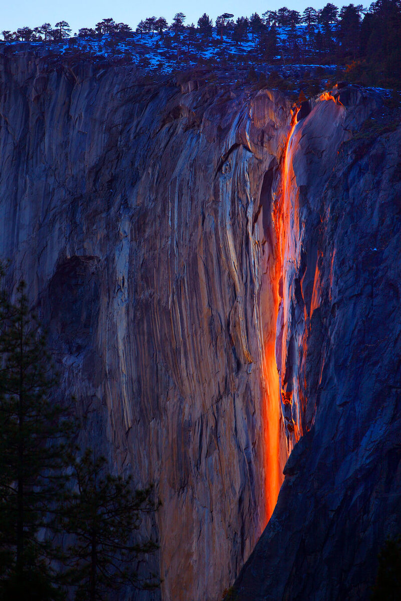 Несколько дней в году в горах Йосемитский национальный парк США можно стать свидетелм удивительного природного явления. Водопад под названием «Лошадиный хвост», вытекающий с одной из самых высоких вершин «Эль-Капитан» неожиданно меняет окраску своих вод на оранжево-красный: кажется, будто на землю падают потоки не воды, а лавы или расплавленного железа.