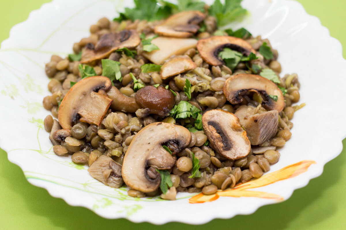 Чечевица 1 стакан, шампиньоны 200-300 г, лук репчатый 1-2 шт, чеснок (по желанию) 1-2 зубчика, морковь 1-2 шт, зелень петрушки или укропа, растительное масло для жарки , соль, перец по вкусу.