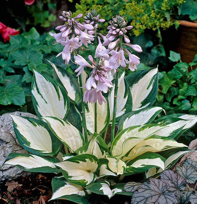 Хоста Фаер энд Айс — огонь и пламя — одна из самых ярких представительниц этого вида растений. Белоснежные листья с тёмно-зелёной окантовкой будут прекрасным фоном для растений на белой клумбе. Это компактный сорт, достигающий в высоту и ширину 30-40 см. Поэтому хосту нужно высаживать на расстоянии 40 см от других растений и друг от друга.