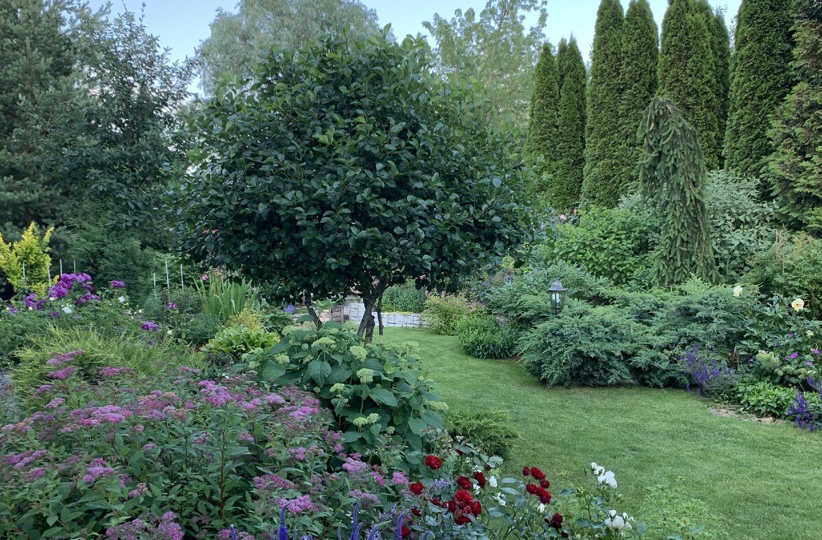 А вот та часть сада, что ниже подпорной стенки, в этом году попала под серьезную реконструкцию. Фото не публикую, берегу ваши чувства. Я три года назад увлеклась колоновидными яблонями, забросив все остальные растения (даже зимой ничего не заказывала в питомниках!). Возилась с 24 саженцами, но в итоге победу одержали муравьи, плодожорки и монилиоз, и я осенью отдала яблоньки хорошему человеку. Яблоневодство, а с ним и другое плодоводство вместе с огородничеством - не моё. Опыт - классная штука. Сейчас в моем садике есть разные цветники и уголки. Я не стала делать комнаты, потому что мне нравится простор, пространство. Вдоль ряда туй расположен самый большой и самый первый миксбордер, который я заложила. Перед туями, чтобы создать ярусность, я посадила кустарники: дёрен, рябинник, пузыреплодник и барбарис. И уже перед кустарниками высадила травянистые многолетники, метельчатые гортензии и розы. Многолетники тоже подбирала разного роста.