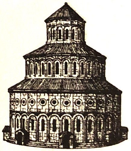 Звартноц представлял собой трехъярусную многогранную башню, увенчанную шатром и опоясанную внешними и внутренними галереями, сквозь арки которых