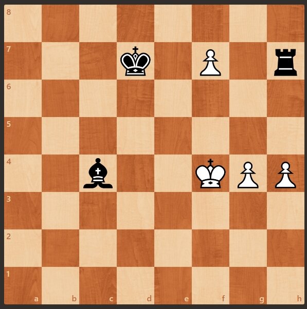 Очередная шахматная задача. У белых три пешки, а у черных - ладья и слон. Если белые поставят на f8 ферзя, то черные дадут шах ладьей на f7. В итоге останется белый слон против 2 белых пешек (это ничья, при правильной игре). Но ход белых, и они получают материальный перевес достаточный для выигрыша.