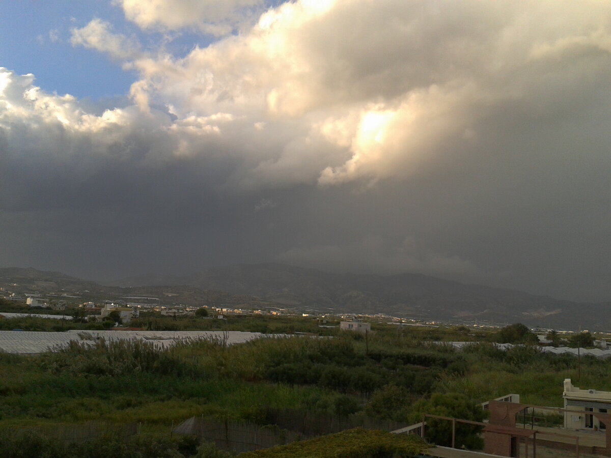 Над Критскими горами засияла двойная радуга. Но высокие морские волны и штормовое предупреждение остались - суда не выходили в море.