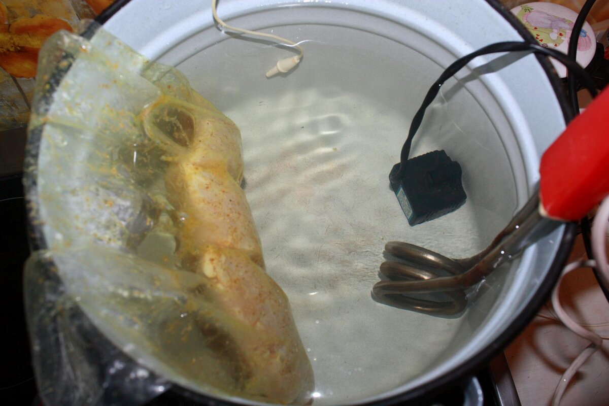 Я иногда готовлю блюда по технологии су-вид. Делаю я это нечасто, поэтому покупать для этого дорогую аппаратуру меня как-то жаба давит. Да и мультиварку все никак не куплю. Я уже показывал, как можно готовить вообще без аппаратуры, с одним только термометром. Разовьем тему.