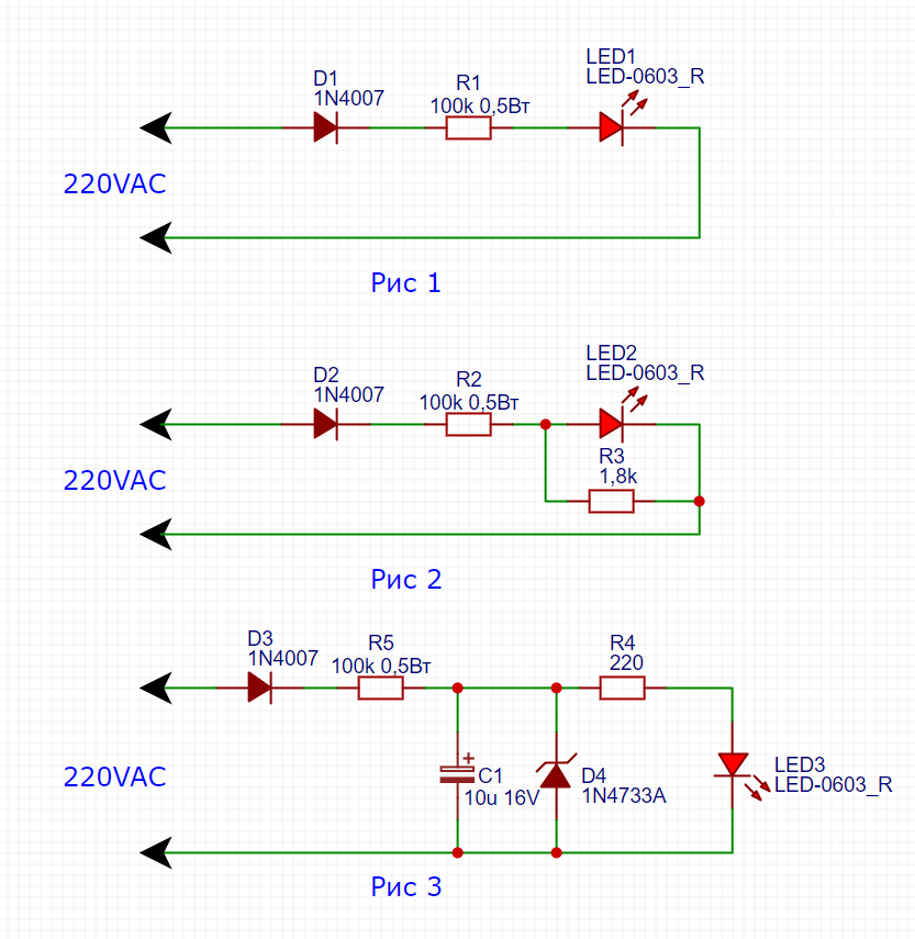 И так схемы будут следующими. По схеме на рис.1 предлагают подключать комментаторы, но автор утверждает, что будут выбросы обратной полярности на светодиоде. Для гашения выбросов автор предлагает поставить сопротивление параллельно светодиоду, как на рис.2. Но данное решение так же не устраивает автора так как на его мнению светодиод будет мерцать с частотой электрической сети, то есть 50Гц и это будет видно. Поэтому далее предлагается улучшить данную схему введя стабилизацию с помощью стабилитрона и электролитического конденсатора, как на рис.3.