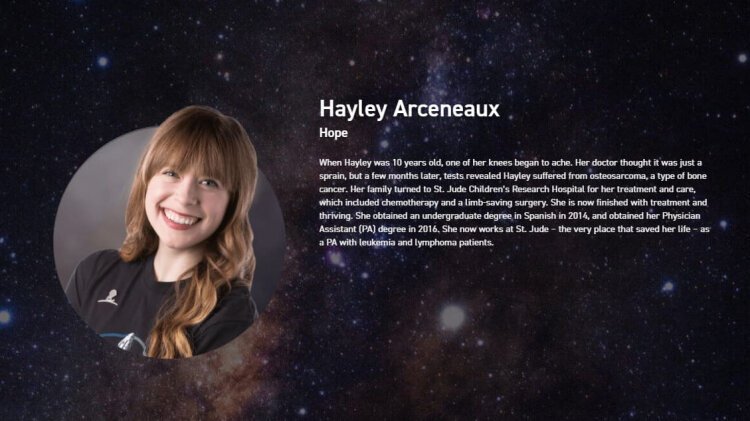 Хейли Арсено (Hayley Arceneaux), которая пережила рак костей, пройдя лечение в Детской исследовательской больнице Святого Иуды (!!!) (химиотерапия и операция по сохранению конечностей). Пройдя курс лечения, она чувствует себя хорошо, получила степень бакалавра испанского языка в 2014 году и степень ассистента врача (PA) в 2016 году. Сейчас она работает в той же больнице Святого Иуды с пациентами, больными лейкемией и лимфомой.