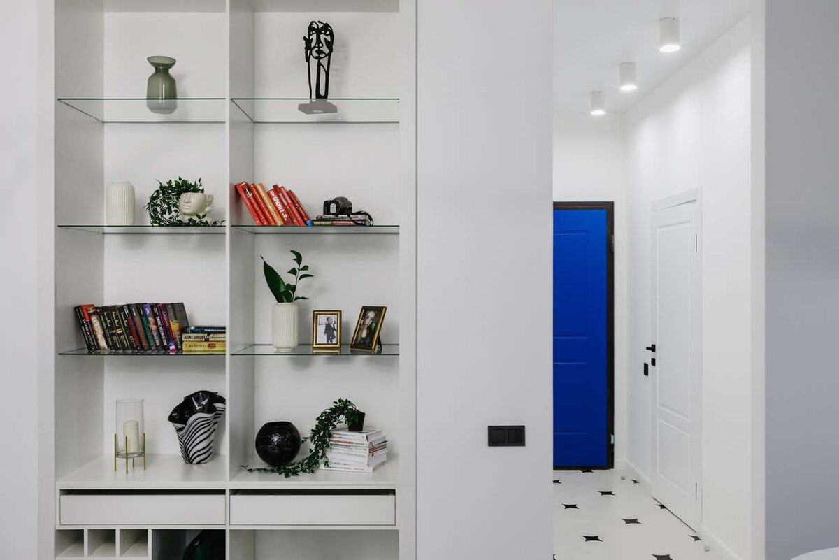 Подобный стеллаж выглядит стильно и прекрасно подойдет для съемного жилья.