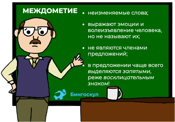 В лексико-грамматической системе языка они стоят на особом месте, так как не называют предметы, действия, количества, эмоции и не принадлежат ни к самостоятельным, ни к служебным частям речи. Непосредственное выражение чувства делает высказывание энергичнее и насыщеннее. Это своеобразные знаки отклика человека на события действительности, символы побуждения или приказа. Их смысл понятен только в контексте.