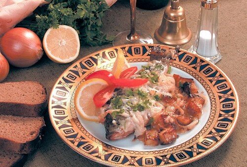 При подаче к столу рыбу выложите на тарелку и украсьте дольками лимона.