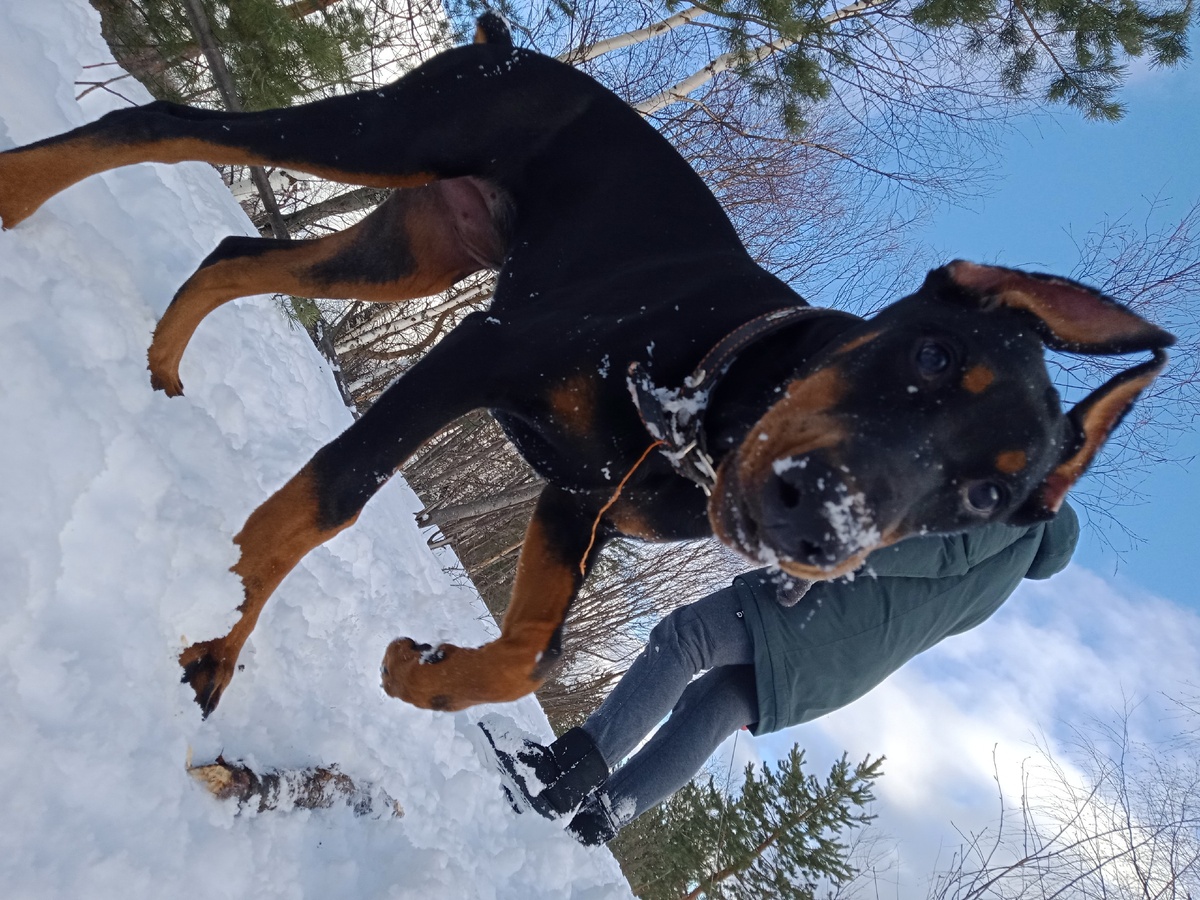 Доберман порода активная и требует очень много внимания ,но в то же время она отлично поддается дрессировке . Главное правильно за мотивировать собаку.