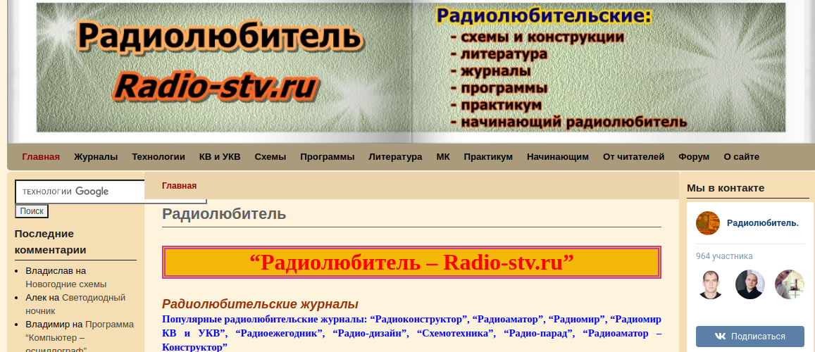 Мы подготовили для Вас Топ-5 сайтов для Радиолюбителей в РуНете. Понятное дело, что "топ" понятие субъективное, но будем надеяться, что поможем Вам открыть что-то новое для себя, своей работы или хобби. 1. http://radio-stv.ru/ - журналы, схемы, программы, раздел "Для Начинающих". Есть своя живая "ламповая" группа в ВКонтакте 2. https://radiolubitel.moy.su/ - журналы, статьи, схемы, ролики и документалки, в общем, вся теория для радиолюбителей 3. http://www.radioliga.com/ - Белорусский журнал «Радиолюбитель», разработки и радиосхемы от бытовой техники до профессиональной, справочники элементной радиоэлектронной базы, отечественные и импортные радиоустройства, радиосвязь на коротких, ультракоротких волнах и аппаратура, спутниковое, обычное и кабельное ТВ, история радиоэлектроники и радиолюбительства и др. 4. https://radiolub.ru/ - огромное количество информации по радиолюбительской тематике, как в виде журналов и книг, а так же в электронном виде 5. http://www.radioman-portal.ru/ - м