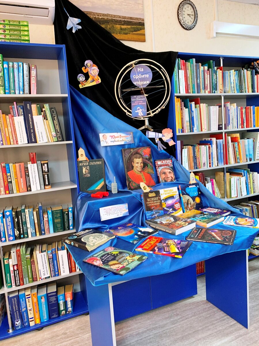 Мы приглашаем вас посетить библиотеку и совершить увлекательное путешествие по нашей галактике, узнать о вращающихся планетах, загадочных взрывах в космосе, познакомиться с замечательными книгами о Ю.Гагарине и других космонавтах.