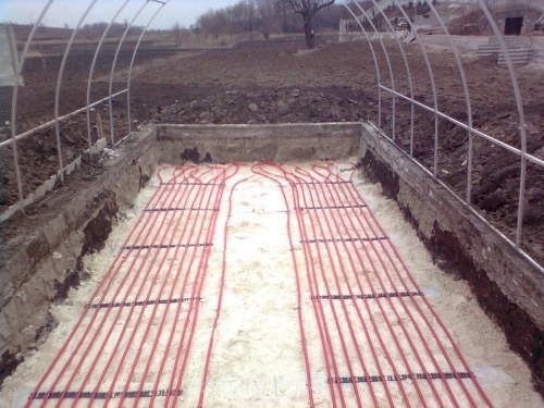 При устройстве греющих систем нужно создать песчаную подушку, которая предохраняет кабель от повреждений. Эти функции выполняет защитная сетка. Взамен песчаной подушки могут использоваться другие материалы для отопления теплицы, к примеру, бетонная стяжка, что существенно увеличивает срок полезной эксплуатации системы. Греющий кабель принято укладывать на ширину грядки.
