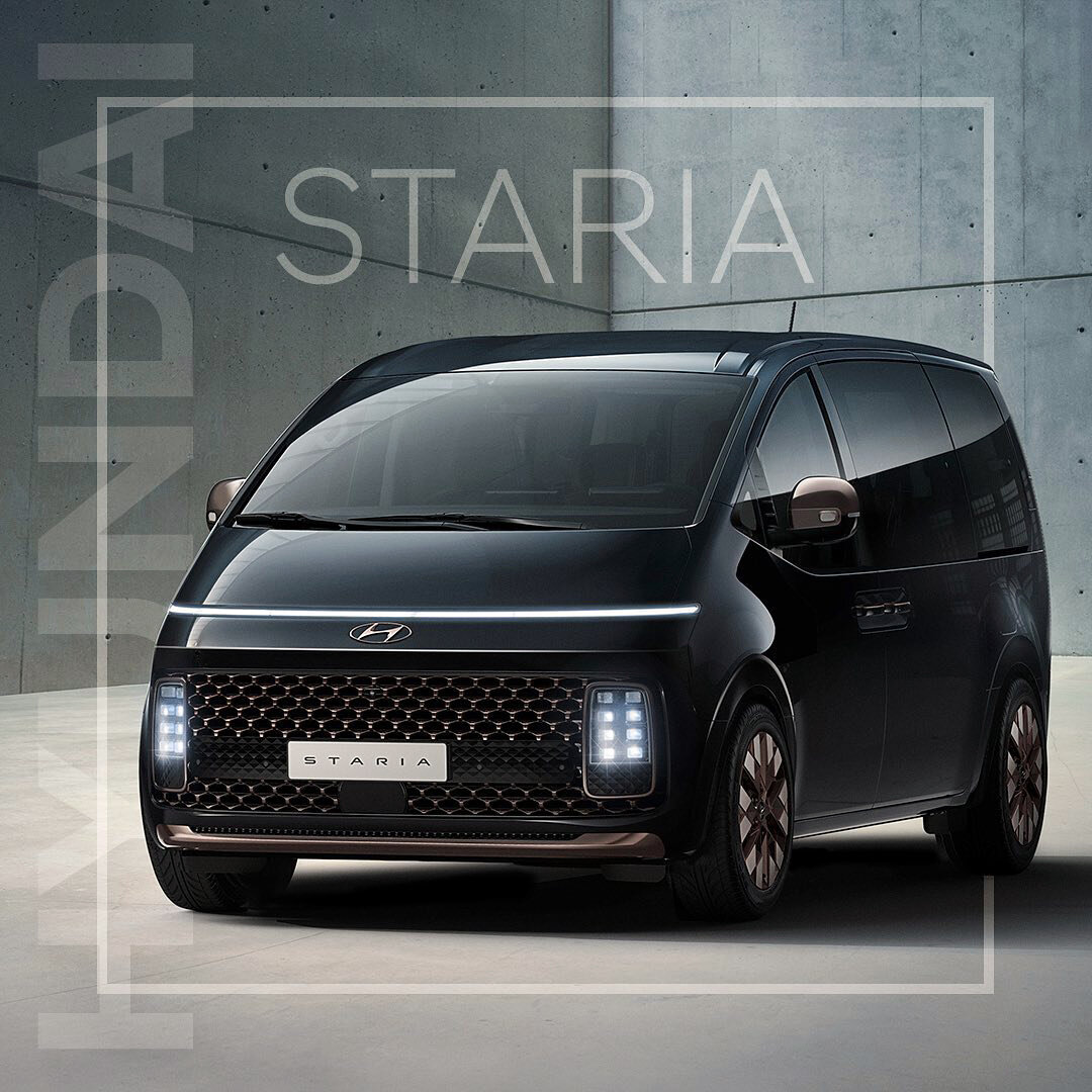 Минивэн STARIA приобрел передовую и оригинальную внешность, ассоциирующийся с космическим кораблем. На это намекает горизонтальная линия ДХО, протянувшаяся по фронтальной части машины. Под ними размещаются ячейки головных фар. Также сходство с космическим кораблем возникает благодаря широкоформатным окнам и заниженному остеклению. Высокие потолки обеспечивают комфорт во время путешествий.