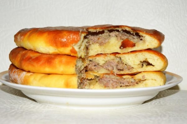 В начинку идет мясной фарш с добавлением в него мелко порезанного репчатого лука.