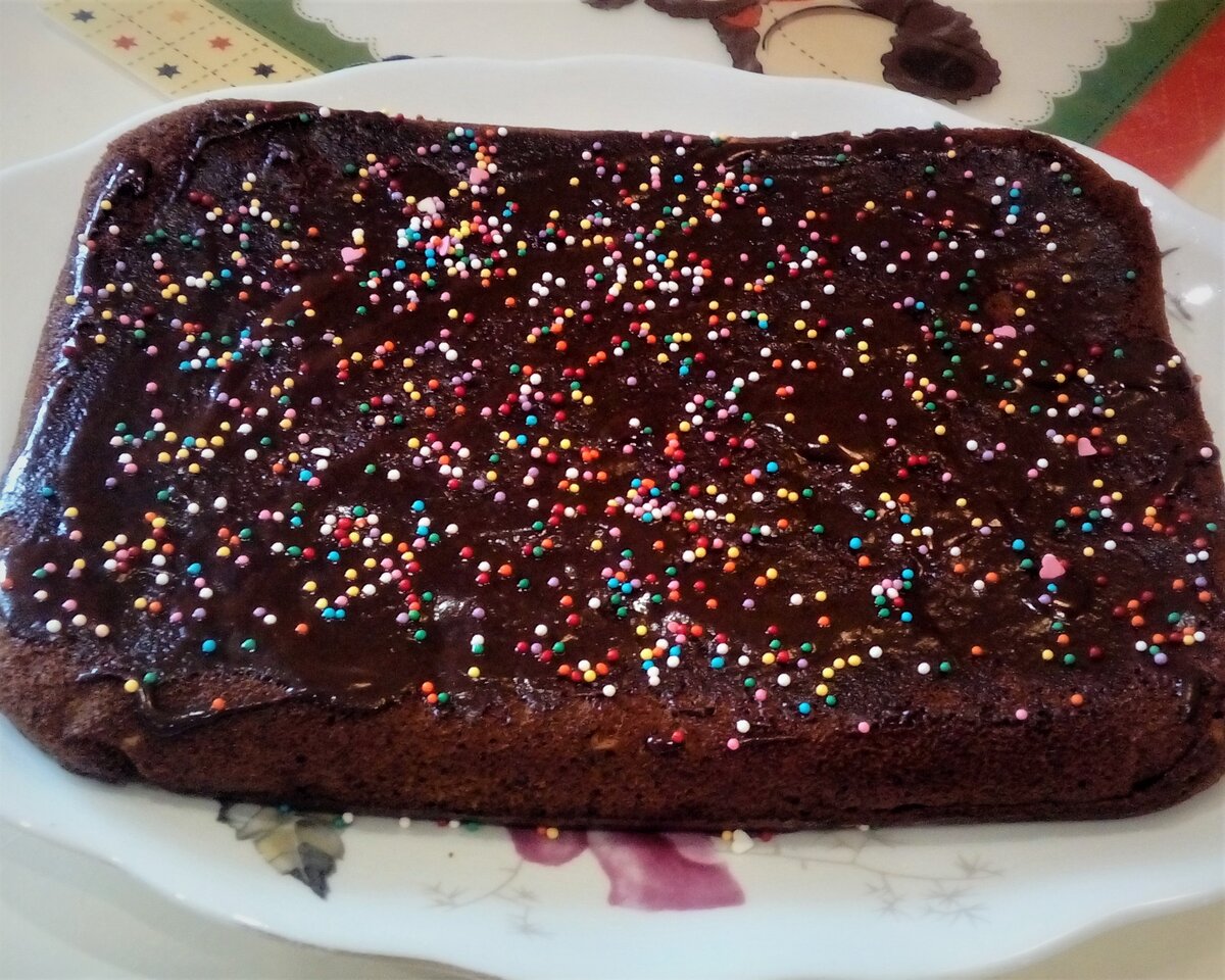 Кекс вынуть из формы, остудить, полить глазурью и посыпать кондитерской посыпкой.
