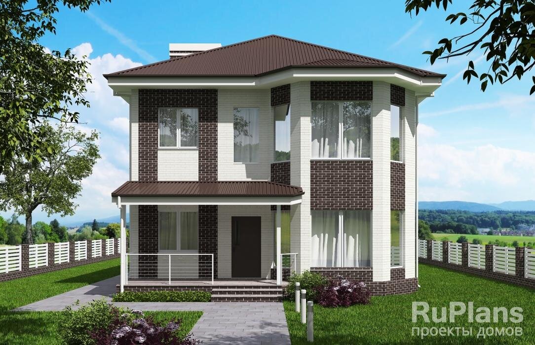 Проект двухэтажного дома площадью 161 квадратный метр с тремя спальнями. Кровля четырехскатная, фундамент ленточный. Наружная отделка облицовочным кирпичом.