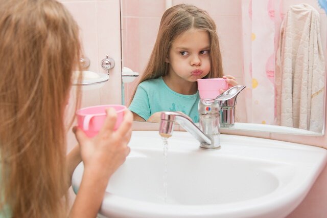 Важно также объяснить – что нужно полоскать не только рот, водичка должна доставать до горлышка, омывая миндалины и заднюю стенку глотки.