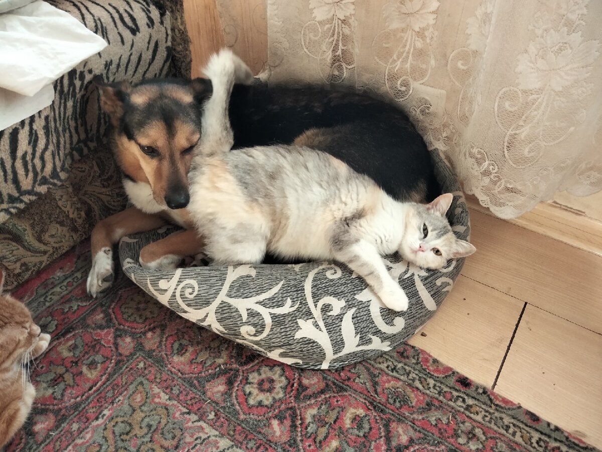 Как кошка с собакой, говорят люди такую фразу... Они тем самым подразумевают извечную вражду и неприязнь тем самым. И если для кого-то еще это был закон природы и жизни, то за все эти годы пока мы с вами наблюдаем за домашним мини-приютом Людмилы Ч. думаю стало всем понятно, что тут этот закон не работает.