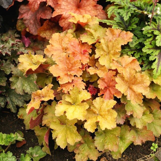 Гейхера Christa ( Криста ). Почвопокровный многолетник. Крупные нарядные листья меняют свой цвет в течение сезона. Цветущие растения производят впечатление праздничного фейерверка, придавая живописную легкость цветникам. Гейхера Криста растение высотой 20-25 см, шириной 30 см. Очень декоративный, колоритный кустик.
