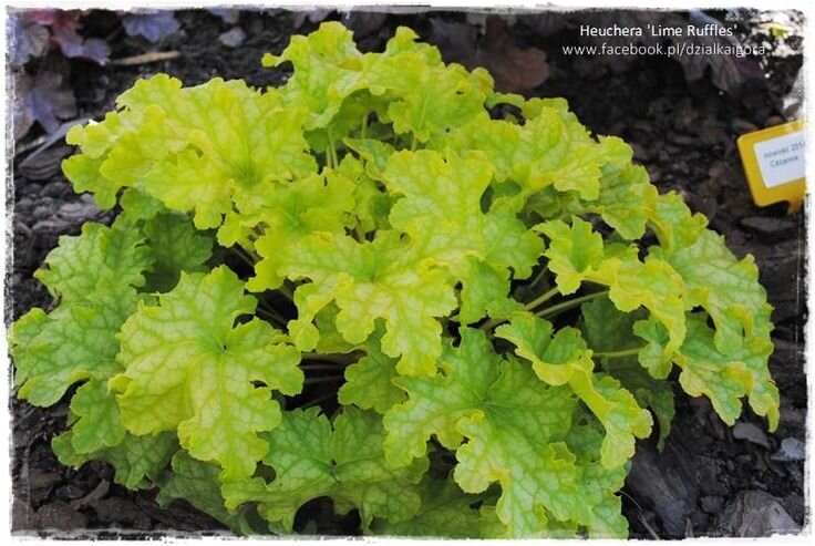 Очаровательный сорт, который будет радовать глаз продолжительное время. Листья некрупные, гофрированные, лаймово - жёлтого оттенка. Летом становятся ярко-лимонными. Цветки белые, очень нежные,расположены на высоком цветоносе. Гейхера Lime ruffles (Лайм Раффлс) переносит низкие температуры, но при подготовке к зимовке основание розетки необходимо замульчировать, окучить. Гейхера может пострадать