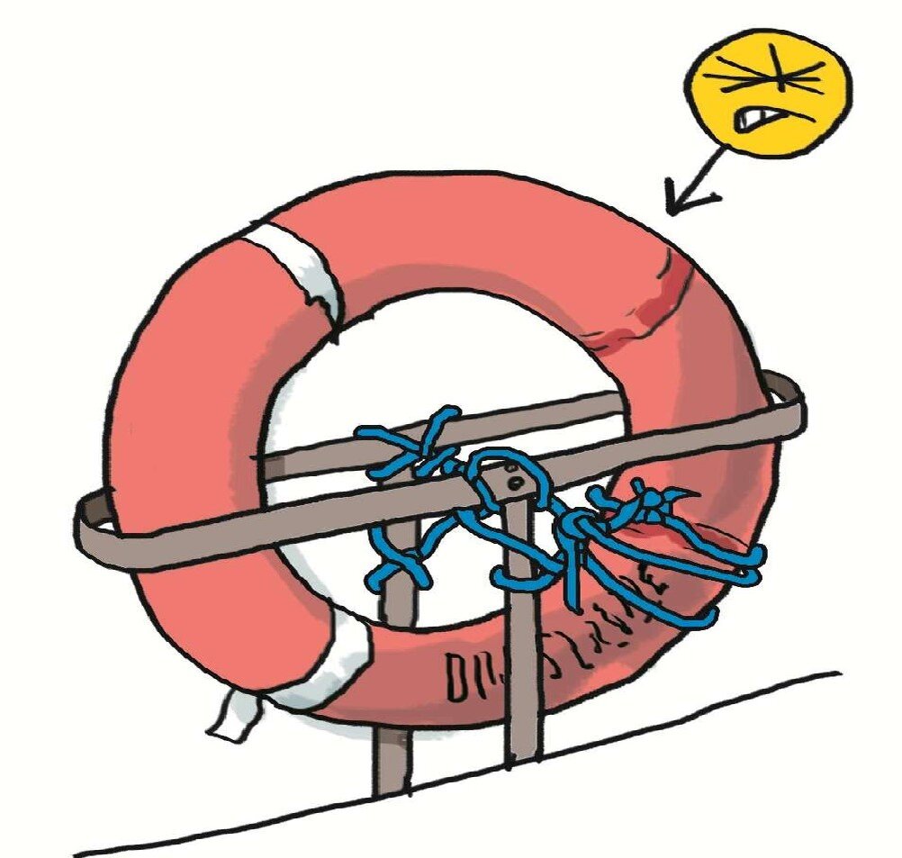 Нельзя так спасательный круг привязывать. Он должен быть всегда готов к немедленному сбросу. А этот круг, пока отвяжут, уже все утонут.