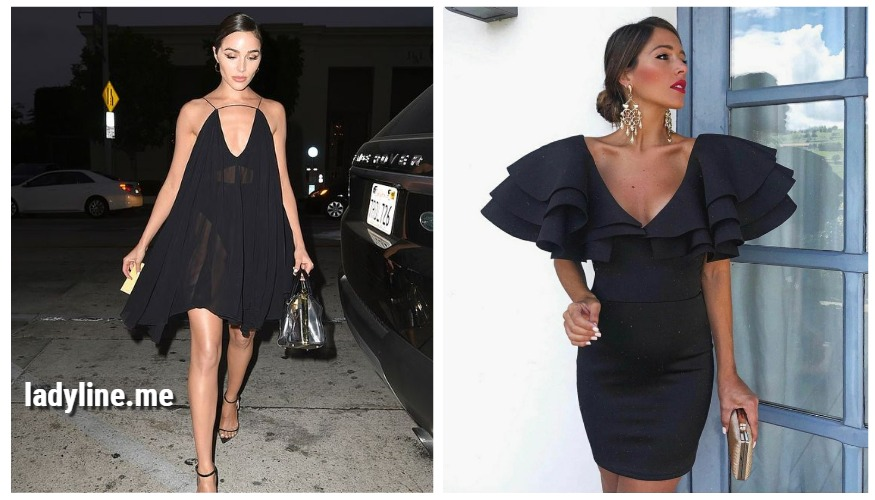 Силуэтное мини черное платье с воланами, выигрышно подойдет модницам с типом фигуры «груша» или «треугольник». За счет объемных воланов на плечах и в районе груди женская фигура приобретает более пропорциональный вид.