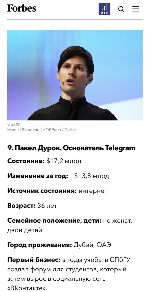 Издание оценивает состояние основателя Telegram в $17,2 млрд. Изменение за год по оценкам Forbes +$13,8 млрд. Рост средств произошёл благодаря выпуску облигаций для привлечения финансов в мессенджер.
