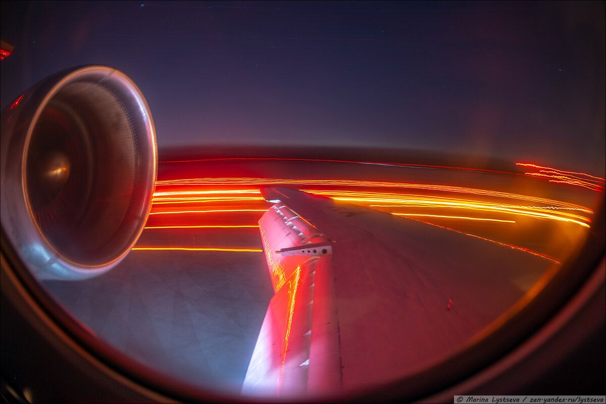 Поооооехали! Самолёт потряхивает, огоньки рисуют красивые треки. Правда, этот кадр сделан уже на посадке: видно, что закрылки в посадочной конфигурации. Но на взлёте картинка почти такая же.