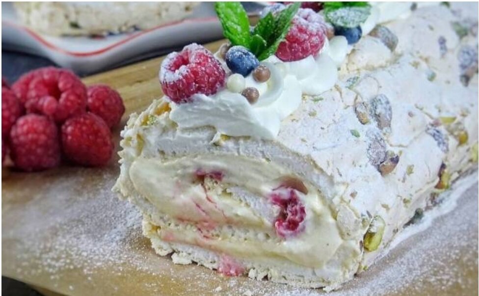 3. Посыпать сверху орешками и отправить выпекаться ~на 25 минут. Поверхность её должна покрыться корочкой и слегка зарумяниться. Вынимаем из духовки, аккуратно берём за края пергамент и переворачиваем готовую меренгу на заранее подготовленный и постеленный пергамент, даем остыть несколько минут и снимаем бумагу, на которой она выпекалась. Взбить сливки до устойчивых пик и смешать с охлажденным кремом. Покрыть нашу меренгу кремом, выложить ягоды (ягодный соус/ варенье). Завернуть в рулет, помогая себе бумагой. Можно наслаждаться сразу, а можно убрать на пару часов в холодильник! Украсить по желанию.