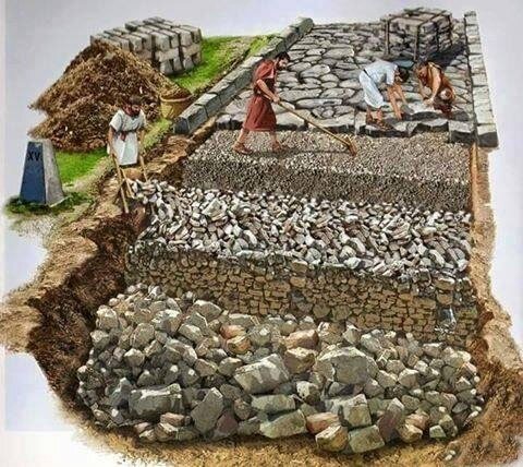 После того как линия была выверена и размечена вехами, в нужном месте с помощью плуга взрыхлялась земля и обозначались границы будущей дороги. Затем воины и наемные рабочие приступали к работе. Многое зависело от особенностей ландшафта и строительных материалов, которые были род рукой, но, как правило, дорога состояла из нескольких слоев . Вначале строители, удалив лишнюю землю, закладывали и утрамбовывали нижний слой из известняка или песка. Вторым слоем служил булыжник величиной в кулак, иногда для верности заливавшийся известью или глиной. Сверху рабочие насыпали гравий или грубый песок вперемешку с горячей известью и уплотняли роликом. Наконец, каменщики мостили дорогу плоскими плитами, придавая ей в середине легкую «горбинку»: благодаря такому уклону дождевая вода стекала в канавы по обочинам. Из-за слоистой структуры дороги достигали порой трех, а то и пяти метров в глубину : недаром кто-то назвал их стенами, вкопанными в землю. Часто римские дороги лет сто кряду не нуждались в починке.