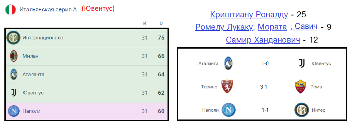7-я команда лиги Рома также проиграла. В итоге в Лигу Чемпионов на данный момент претендуют: Интер, Милан, Аталанта и Ювентус. Кротоне на последней строчке, её от спасительного места отделяет 15 очков.